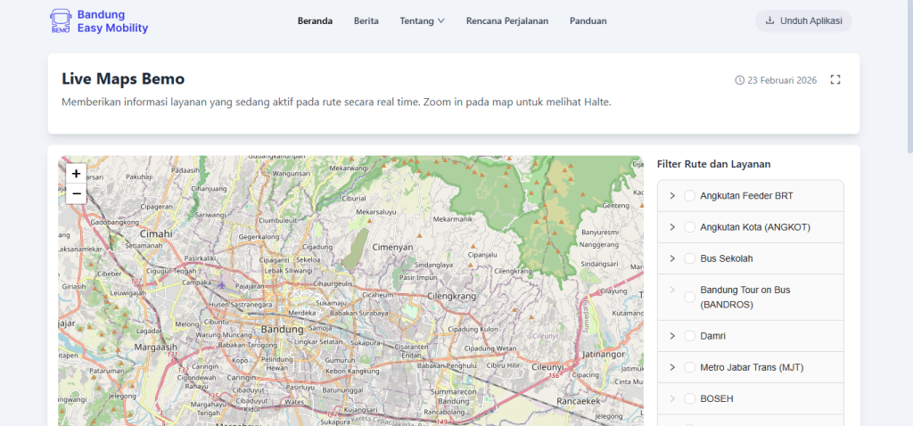 Gunakan BEMO – Bandung Easy Mobility untuk mengetahui posisi angkutan umum, rute perjalanan, dan informasi halte dalam satu peta yang interaktif dan mudah digunakan.